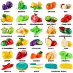 A variety of realistic fruits and vegetables can help stimulate your baby’s imagination and expand your vocabulary by naming new foods.