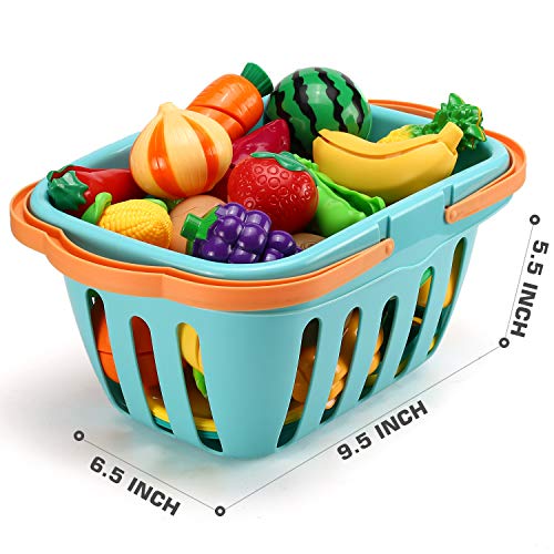 • 35 items pretend play food set for toddlers: 26 different kinds of play fruit and vegetables (can be separated into 61 small pieces), a toy grocery basket, 2 cutting boards, 2 kitchen knives, and 4 dinner plates.