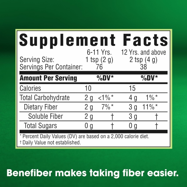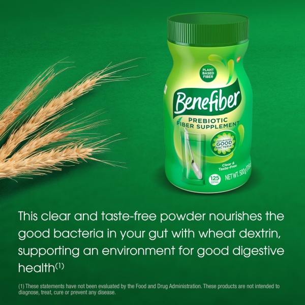 Details: Benefiber Daily Prebiotic Fiber Supplement Powder is designed to strengthen and nourish the good bacteria, helping support your digestive health (1). A source of daily fiber, this unflavored powder contains the plant based fiber wheat dextrin to help nourish the good bacteria in your digestive system (1)(2). Sugar-free, gluten-free, taste-free and grit free, this clear fiber powder dissolves completely in foods and non-carbonated beverages like water, coffee or juice, so you can enjoy all the benefits of prebiotic fiber supplements in a variety of foods and beverages (3). For ages 12 and older, stir two teaspoons of Benefiber prebiotic fiber powder into four to eight ounces of a non-carbonated beverage or soft food three times daily. For children ages 6 to 11, use one teaspoon of this prebiotic powder three times daily. Benefiber makes taking fiber easier. (1) These statements have not been evaluated by the Food and Drug Administration. This product is not intended to diagnose, treat, cure or prevent any disease. (2) The wheat has been processed to allow this food to meet the Food and Drug Administration (FDA) requirements for gluten-free foods. (3) Not recommended for carbonated beverages. Use as directed.