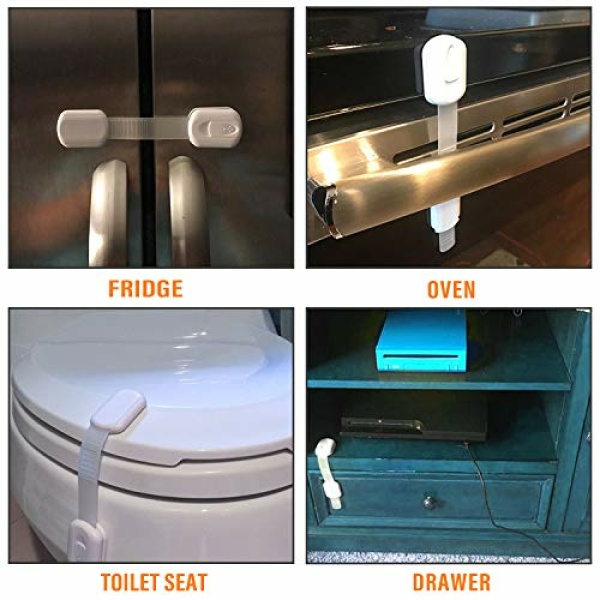 • MULTIUSE:Our baby safety locks can adjust the strap length fit for cabinet,drawer,oven,stove,fridge,wash machine,toilet seat,doors,trash can,freezer,slide doors,appliance,containers and more.Keep your baby away from the dangers in your home.