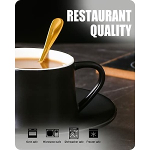 Lareina Porcelain Cappuccino Cups with Saucers, Spoons and Cup Stand – 7 Ounce Ceramic Coffee Cups for Americano, Latte, Cafe Mocha and Tea – Set of 6, Black