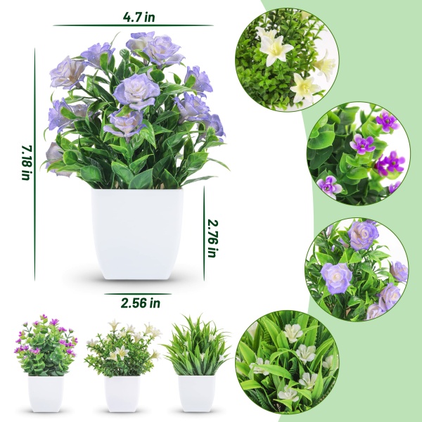 • 【Size&Quantity】Contains four fake potted plants with flowers, each plant is 7.18″ tall and 4.7″ wide, and the pot is 2.76″ tall and 2.56″ wide