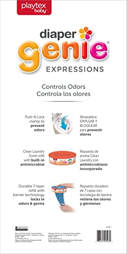 • NO MORE STINK: Diaper Genie Expressions Pail is a compact diaper trash can that prevents odor spread while disposing of your baby’s dirty diapers! The Push-N-Lock clamp helps lock-in escaping odor to keep your nursery smelling fresh.