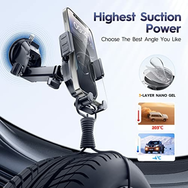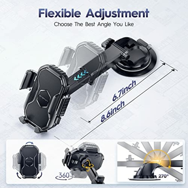 • Adjuestable Long Arm: EYEMAY phone mount for car has a 360° rotation ball-joint and telescopic arm, you can adjust best anlgle as you wish. Provide you with safer driving whether you are navigating, or charging. Applicable to all cars, SUVs, trucks, and taxis, Ubers.