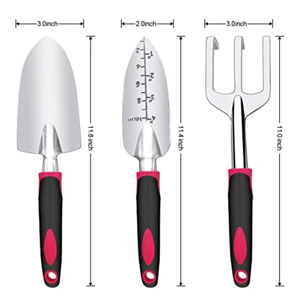 Details: Cultivate Your Gardening Passion Whether you’re just starting out, all about herbs or a passion for flowers, the 3-Piece Gardening Set is designed to take your gardening to the next level . Each set of 3 comes with graduated shovel (13” x 3.5” x 1.7”), transplant shovel (13” x 2.8” x 1.8”) and tiller hand harrow (11” x 3.5” x 2.8”). So now you’ll have all the tools you need to weed properly, transplant with care, loosen soil with ease and watch your plants thrive . We love creating products that inspire a smile, and our gardening kits are lasting proof of that. No need to worry about rusting. No need to Each set of 3 comes with graduated shovel (13” x 3.5” x 1.7”)transplant shovel (13” x 2.8” x 1.8”)tiller hand harrow (11” x 3.5” x 2.8”)So now you’ll have all the tools you need to weed properly, transplant with care, loosen soil with ease and watch your plants thriveWe love creating products that inspire a smile and our gardening kits are lasting proof of that. No need to worry about rusting, No need to deal with tool breakage or bending. Not only did we use high quality stainless steel that prevents corrosion but we also made the tool thicker than most.Impressive toughness makes it something you need to buy The last garden tool set.Here are more reasons to love this garden tool set: Ergonomic rubber handle for more grip and comfort.Hanging holes at the end of the handle, Easy to store.The transplant shovel is graduated to help you move plants with precision.The protective cover on the tillage rake prevents wear and tear.Backed by a 100% hassle-free money-back guarantee. Click ‘Add to Cart’ now , get a completely risk-free set of gardening tools!