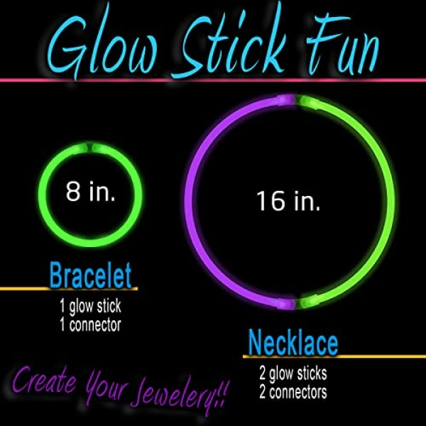 Thoughtfully assembled to provide the ultimate glow party experience. Use the connectors to create unique and spectaculars that you can play with or use to decorate your event or party. Make bracelets, glasses, balls, flowers or whatever you want to build and allow your eyes, wrists and neck parts glow. The possibilities are endless for unlimited glowing fun.