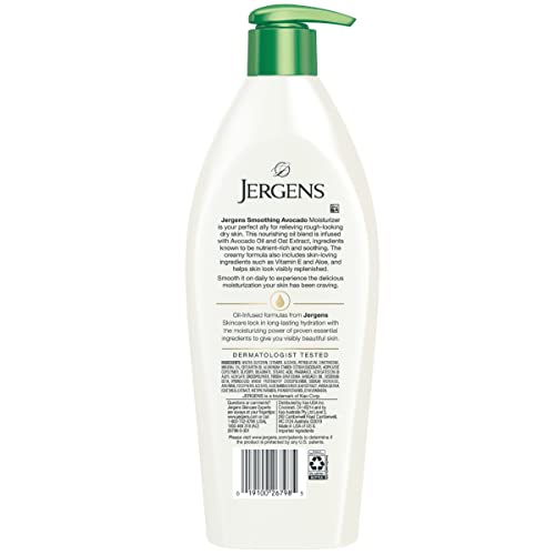 Details: Pamper yourself with Jergens Oil-Infused Smoothing Avocado Moisturizer. This oil-infused 24-hour moisturizer is nourishing and restorative with essential ingredients that give your skin the daily moisture it needs. Infused with Avocado Oil, known to sooth and add moisture, and Vitamin E, this formula leaves skin silky smooth and visibly replenished for a full-body moisture. Satisfaction Guaranteed. Limitations may apply.