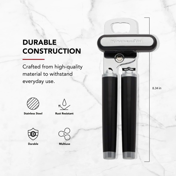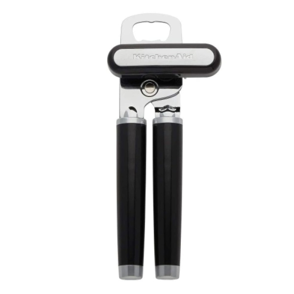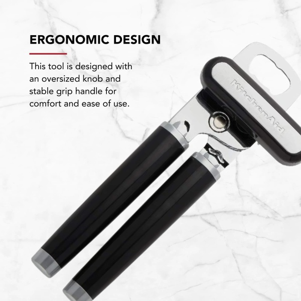 Details: Open any sized can or bottle with the KitchenAid Classic Can Opener. The durable, razor-sharp stainless steel cutting wheel easily pierces and smoothly slices through cans, while the large knob provides a secure grip for effortless turning. The oversized, ergonomic handles provide maximum comfort and control for simple, safe use. This 2-in-1 tool features an integrated bottle opener to remove caps with ease. Hand wash with warm water and a mild detergent; rinse and dry immediately. One year hassle-free replacement and lifetime limited warranty.