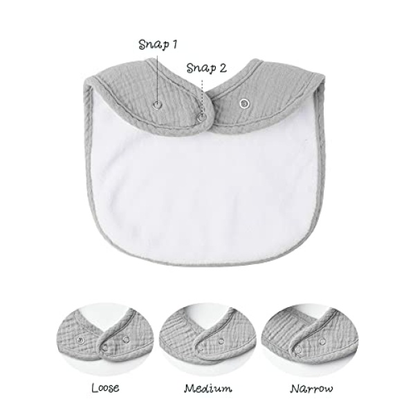 • SOFT and ABSORBENT: The front of baby bibs are made of 100% cotton(Muslin) and the back are polyester(comfort fleece) for maximum absorption with skin-friendly soft touch. The bib soaks up all drools and spits to keep you and your baby clean and dry, no more wet clothes!