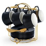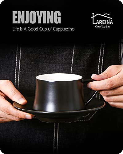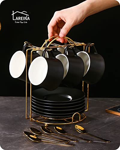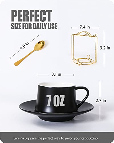 Lareina Porcelain Cappuccino Cups with Saucers, Spoons and Cup Stand – 7 Ounce Ceramic Coffee Cups for Americano, Latte, Cafe Mocha and Tea – Set of 6, Black