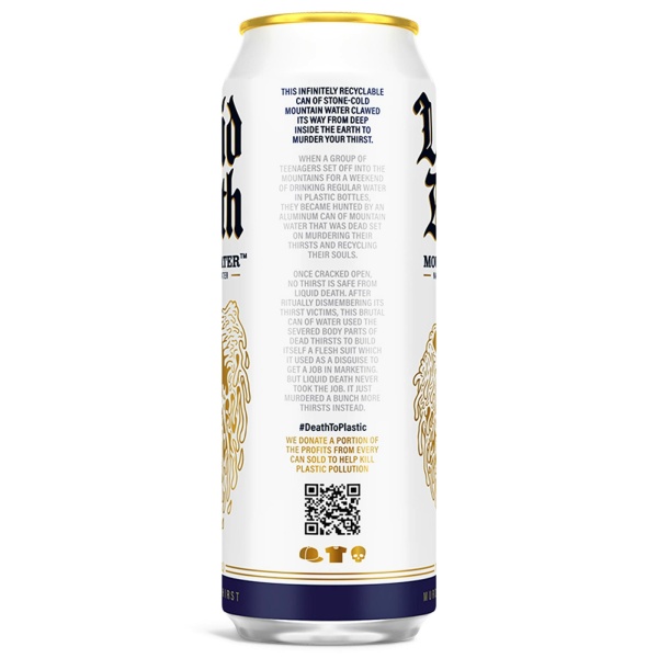 Details: Liquid Death Mountain Water comes from a deep underground mountain source protected by a few hundred feet of stone and contains naturally occurring minerals (aka electrolytes) that aren’t just good for your body, they will murder your thirst. Instantly.