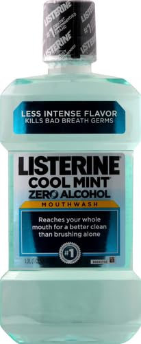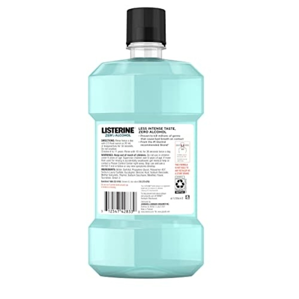 - 1-liter bottle of Listerine Zero Alcohol Cool Mint Alcohol-Free Mouthwash for bad breath kills 99.9% of bad breath germs with a less intense taste, for a fresher and cleaner mouth than brushing alone