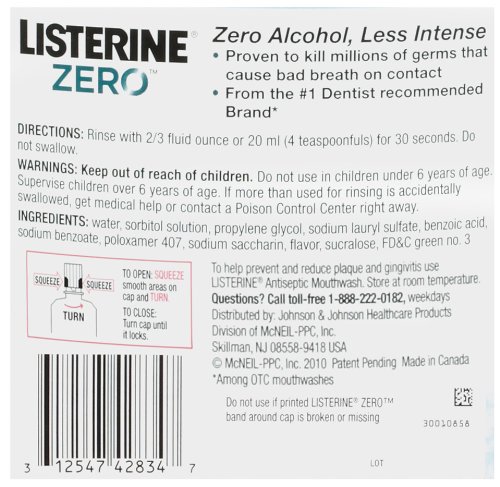 Details: Say goodbye to bad breath with Listerine Zero Alcohol Cool Mint Alcohol-Free Mouthwash in a refreshing, less intense Cool Mint flavor. This daily oral rinse mouthwash kills 99.9% of bad breath germs with a less intense taste for a fresher and cleaner mouth than brushing alone. It features flavors found in Listerine Antiseptic Oral Care Mouthwash, but in a less intense alcohol-free mouthwash formula. From the #1 dentist-recommended brand of over-the-counter mouthwashes, this great-tasting Cool Mint flavor of this less intense, fresh breath mouthwash leaves your mouth feeling clean and refreshed. Get 24-hour protection from bad breath germs by rinsing with this minty mouthwash for 30 seconds twice a day, both morning and night as part of a regular oral and dental hygiene routine.*This site contains current product information and may differ from the information on the product packaging you may have.