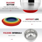 - 🍜[ NON SLIP BOTTOMS] Flat silicone grip portion on the bottom would prevent the metal bowls slippage when mixing, beating and whipping! Also protect the desk from high temperature.
