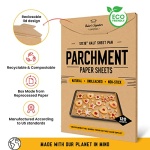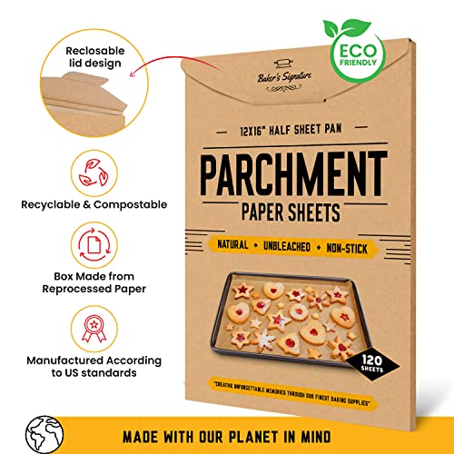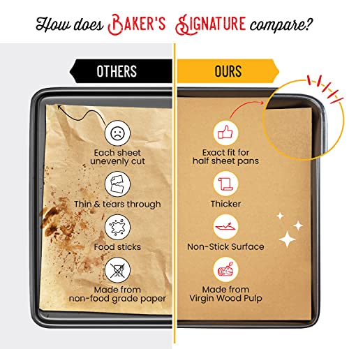 Details: Baker’s Signature Parchment Paper Baking Sheets Our parchment paper baking sheets are truly a baker’s must have. Baker’s Signature sheets will not curl, burn or stick taking all the hassle out of your baking. Pre-cut 12” x 16” parchment sheets are sized just right for the standard cookie sheets. They lay flat right out of the box and come in easy to store packaging to maintain freshness and shape. Cleanup Easier Than Ever Save time by lining your baking pan with parchment paper sheets instead of measuring and cutting pieces from conventional parchment rolls. When done baking, simply slide the parchment paper and baked goods onto a cooling rack leaving the tray clean! Non-Toxic and Unbleached Baker’s Signature parchment sheets are eco-friendly and unbleached. Made from 100% natural wood pulp with an addition silicone coating. They are more pliable than the white parchment paper and because they are unbleached, they are better than using aluminum foil and Quilon parchment sheets. So Many More Different Uses Besides Baking Our sheets are not only perfect for baking sweets, they work great for cooking fish, chicken, and pizza. Since they are moisture proof, they can be used for beautifully wrapping any type of food. Whether you are wrapping sandwiches for the kids or making a lunch to-go, our sheets will keep your meal fresh and safe. Baker’s Signature sheets are also microwave friendly. Get the most amazing parchment paper sheets on the market today and enjoy hassle free baking for years to come!