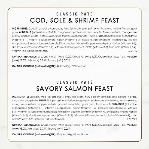 • Canned cat food variety pack featuring Cod, Sole and Shrimp, Savory Salmon or ocean whitefish and tuna as the number one ingredient