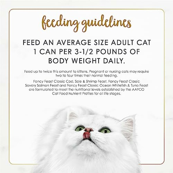 Details: Bring the tastes of the ocean to your cat’s dish with Purina Fancy Feast Grain Free Classic Seafood Feast Collection cat food. This soft cat food variety pack features a tasty assortment of cat food entrees, made with real fish and seafood, to satisfy her cravings for flavor. The smooth pate texture is pleasing to her palate, and the high-quality canned cat food recipes let you feel good about filling her dish. With essential vitamins and minerals to support her overall health, this wet cat food variety pack makes it easy to care for your cat’s nutritional needs. The unmistakable aroma is sure to get her attention every time you open a can, and the mouthwatering taste is sure to have her running to her dish at mealtime. Offer up a different flavor at every feeding, and rest easy knowing she’s getting 100 percent complete and balanced nutrition in her bowl. Your favorite feline loves you just like you love her. Keep that love growing with an order for this Purina Fancy Feast wet cat food collection.