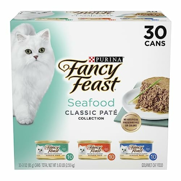 Purina Fancy Feast Seafood Classic Pate Collection Grain Free Wet Cat Food Variety Pack – (Pack of 30) 3 oz. Cans