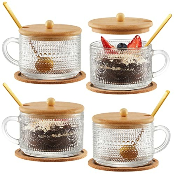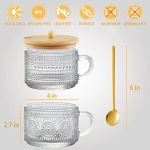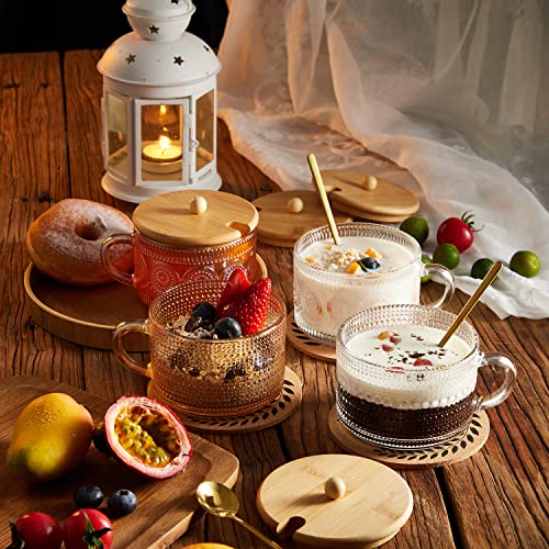 Tekuve Vintage Glass Coffee Mugs Set of 4, Clear Embossed Tea Cups, Coffee Bar Accessories, Iced Coffee Cups with Bamboo Lids and Spoons for Overnight Oats, Yogurt, Cappuccino, Latte(4T)