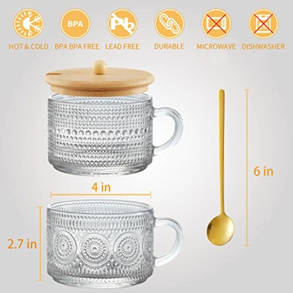 • SAFE AND RELIABLE GLASS CUPS: Made of 100% lead-free glass, BPA-free, completely food safe. With a large capacity of 14oz, it is suitable for cappuccino, latte, tea, whisky, juice, yogurt, overnight oats, desserts, etc. It can be used as a coffee cup, tea cup, beverage cup, overnight oat cup, etc. Suitable for use at home, office, coffee shop, bar, party, etc., making your life full of elegant retro atmosphere.
