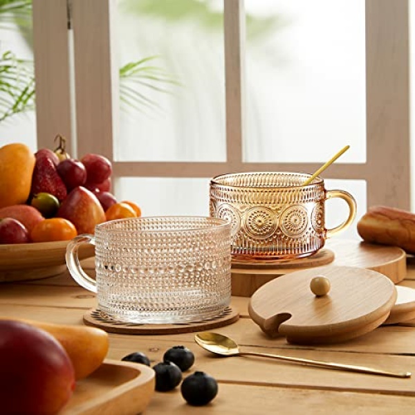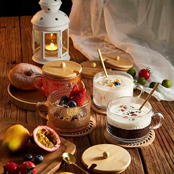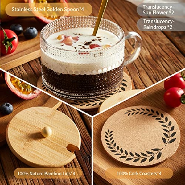 • YOU WILL GET: 4 vintage coffee cups(4 Translucent cups with embossed sunflower and raindrop patterns), 4 unique natural bamboo covers, 4 stainless steel spoons, and 4 cork coasters. This practical combination caters to your daily needs