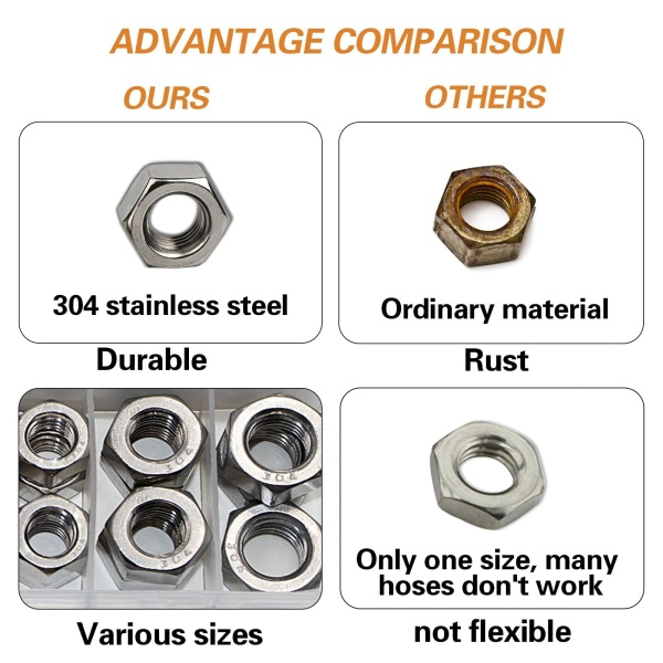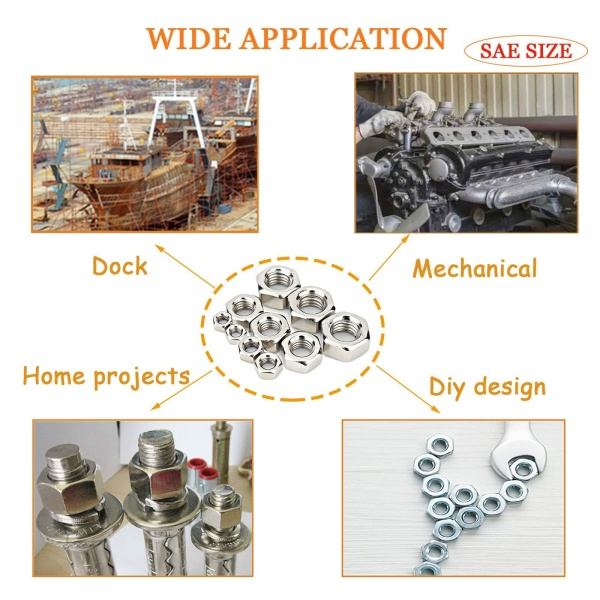 • 【High Quality】:Sae Hex nut hardware kit made of high quality 304 stainless steel,which features is strength strong,weak magnetic offers good corrosion resistance in bad environment like high temperature,superior rust-proof,prevent the bolt from being exposed and falling off,providing better firmness.