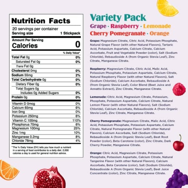 • NATURAL TASTE WITHOUT THE SUGAR: Adding electrolyte powder provides enhanced hydration without the sugar, carbs, and calories. Naturally sweetened with organic stevia leaf and infused with real fruit flavors. Contains important minerals like Magnesium, Calcium, and Potassium. Plant based flavors and colors- Vegan, gluten free, caffeine free, soy/dairy free, keto friendly, paleo-friendly, Non-GMO. We don’t use any artificial sweeteners like erythritol, sucralose, saccharin, or aspartame.